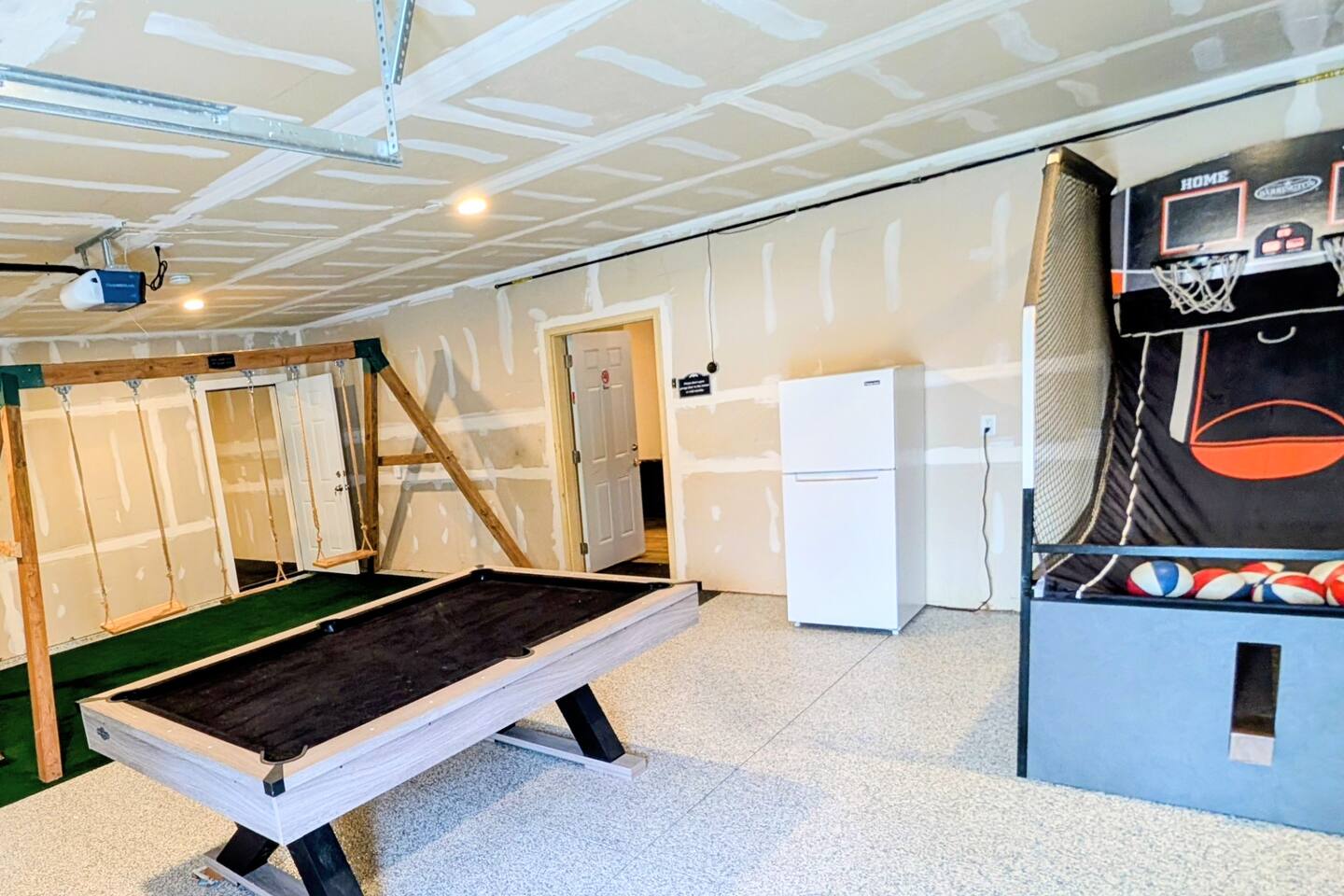 Large 6 bedroom property with 4 full baths and two half baths that sleeps up to 20 people. This property is unique being two townhomes( A&B) offered as one stay. Access to each unit is done so via the front or rear doors. There is also a door that connects the units via the bonus rooms. TOWNHOME Unit A -- Bedroom 1: Twin over double bunk bed with twin trundle Bedroom 2: Queen bed Bedroom 3: King bed with attached Full Bathroom 2 Full bathroom 1 main level Half bathroom 1 located in basement TOWNHOME Unit B -- Bedroom 4: Two twin beds and one double bed Bedroom 5: One double bed and one twin bed Bedroom 6: King bed with attached Full Bathroom 4 Full bathroom 3 Half bathroom 2 located in basement PARKING Our driveway is able to accommodate 8 cars with additional street parking out front. FULL KITCHEN The kitchen has everything you need to make meals during your stay, including pots, pans, bakeware, mixing bowls, plates, glassware, silverware, cooking utensils, toaster, blender, salt & pepper packets, spice packets, cooking spray, and more! COFFEE & TEA Each townhome has a coffee maker and Keurig mini plus. We provide one bag per side of Bella Goose coffee grounds fresh from their roastery along with starter k-cups. You will also find a tea kettle along with provided green tea bags and both sugar and honey packets. GRILLS The property has a gas grill located on the property with extra propane tanks if you should run out. Grilling utensils can be found in the units. FIRE PIT Spend your nights around a cozy campfire. This is the perfect way to unwind and relax after a busy day exploring all the Dells has to offer. NEWLY UPDATED SPRING 2025 We renovated our basement and converted our garages into bonus rooms. Each basement has a mural professionally done by a local artist. Then for the basements and the bonus rooms we added the following: - Heated garages with epoxy flooring - 2 foosball tables - brand new pool table - 2 basketball arcade games - 2 full size picnic tables for family style meals - 3 pub tables and stools - Jungle gym for kids ages 3-10 - Swing set for kids ages 3-10 - Swing set that kids AND adults can use. Goes great with a cold beverage. - Adirondack chairs for comfy hangouts in doors or outside